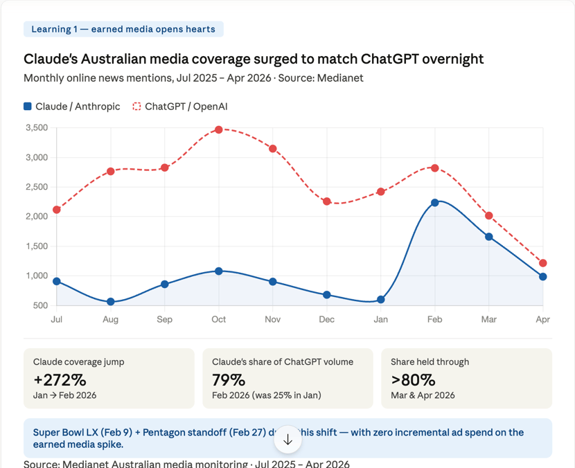 For most of 2025, ChatGPT dominated Australian media coverage. Around 2,500 online news articles a month. Claude was sitting at roughly 700. Not even close.