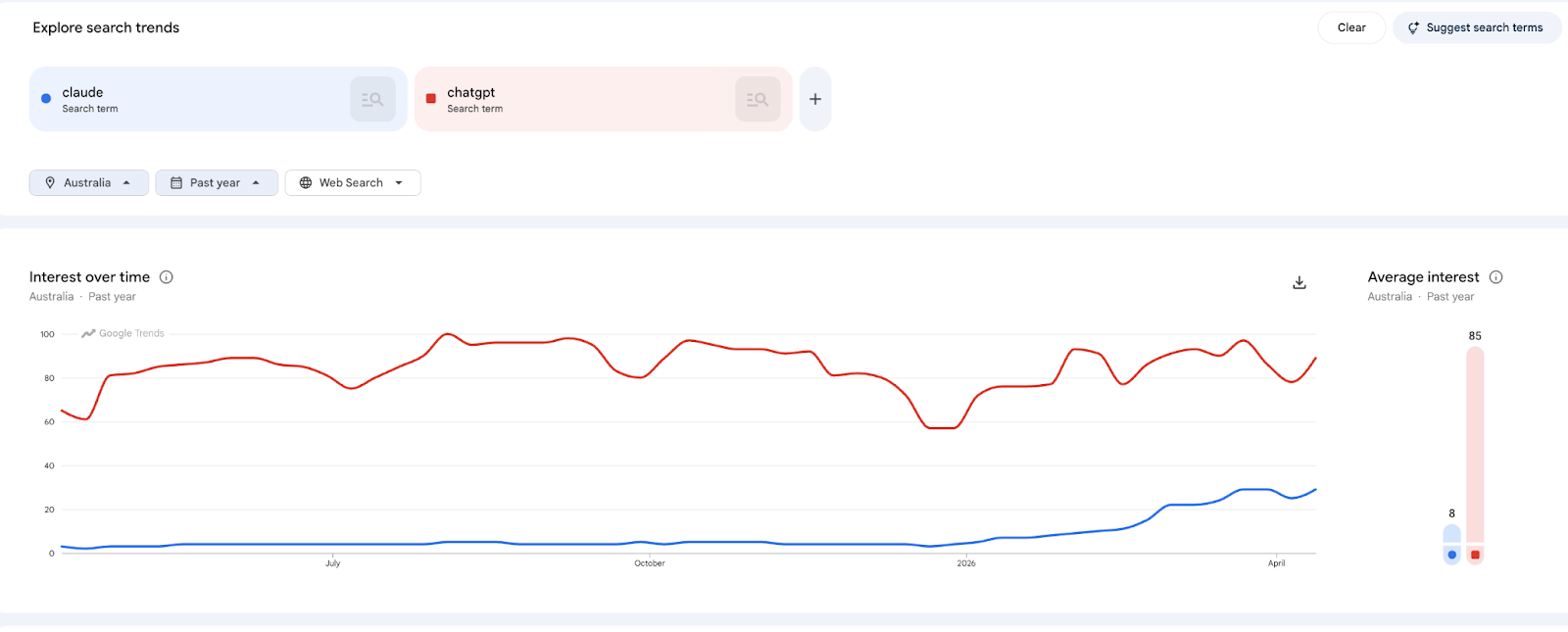 Claude's monthly coverage jumped to 2,236 articles — nearly matching ChatGPT's 2,820. By March and April, Claude was consistently generating over 80% of ChatGPT's coverage volume. In Google Trends Australia, Claude's relative search interest climbed from a near-zero baseline to 28, a 14x increase, while ChatGPT held flat at 85.