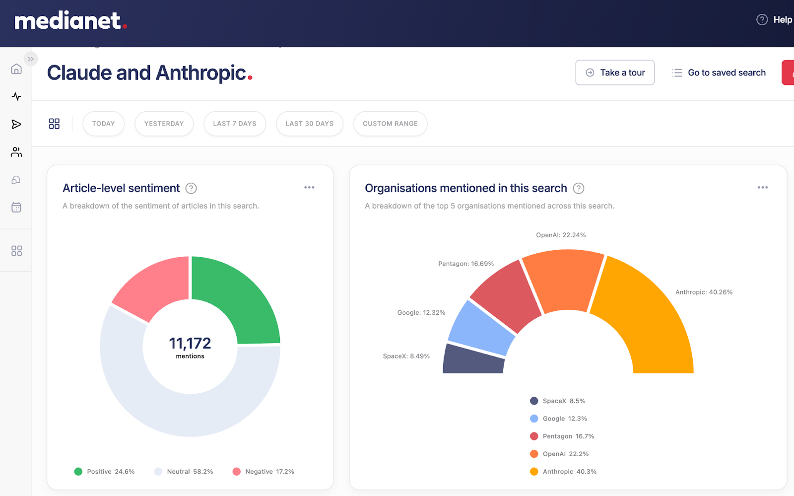 More striking is who appears alongside each brand. In Claude's coverage, the Pentagon is a co-mentioned organisation in 16.7% of stories. ChatGPT's co-mention map is dominated by Microsoft, Nvidia and Meta, which indicates a more commercial and competitive narrative. Claude's is an ethics, governance and values story. And those stories align with the brand identity and values Anthropic needed to differentiate itself from their giant competitor.